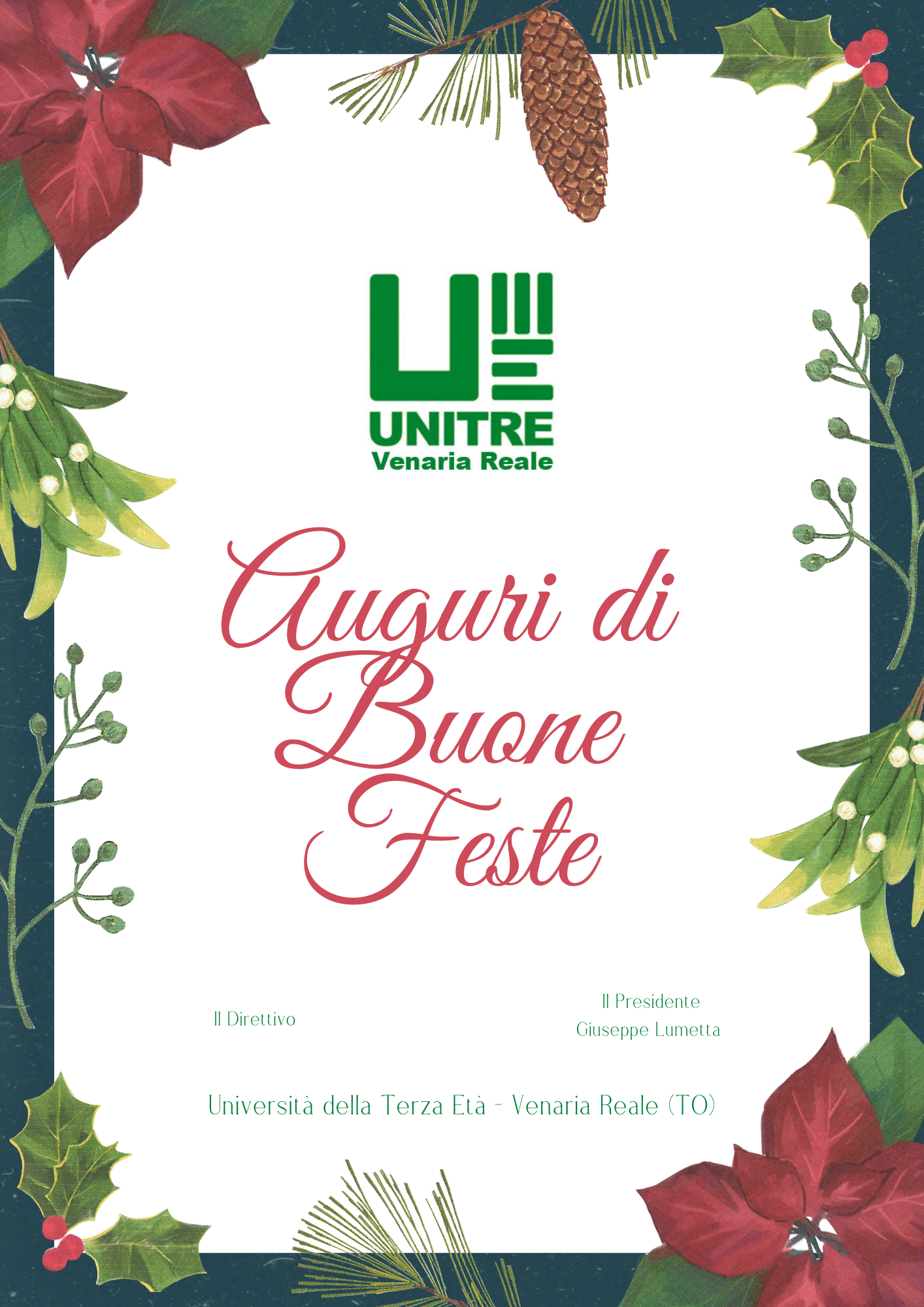 Il Direttivo dell'Unitre di Venaria Reale e il Presidente Giuseppe Lumetta, augurano BUONE FESTE ai docenti, agli allievi e a tutti i collaboratori.