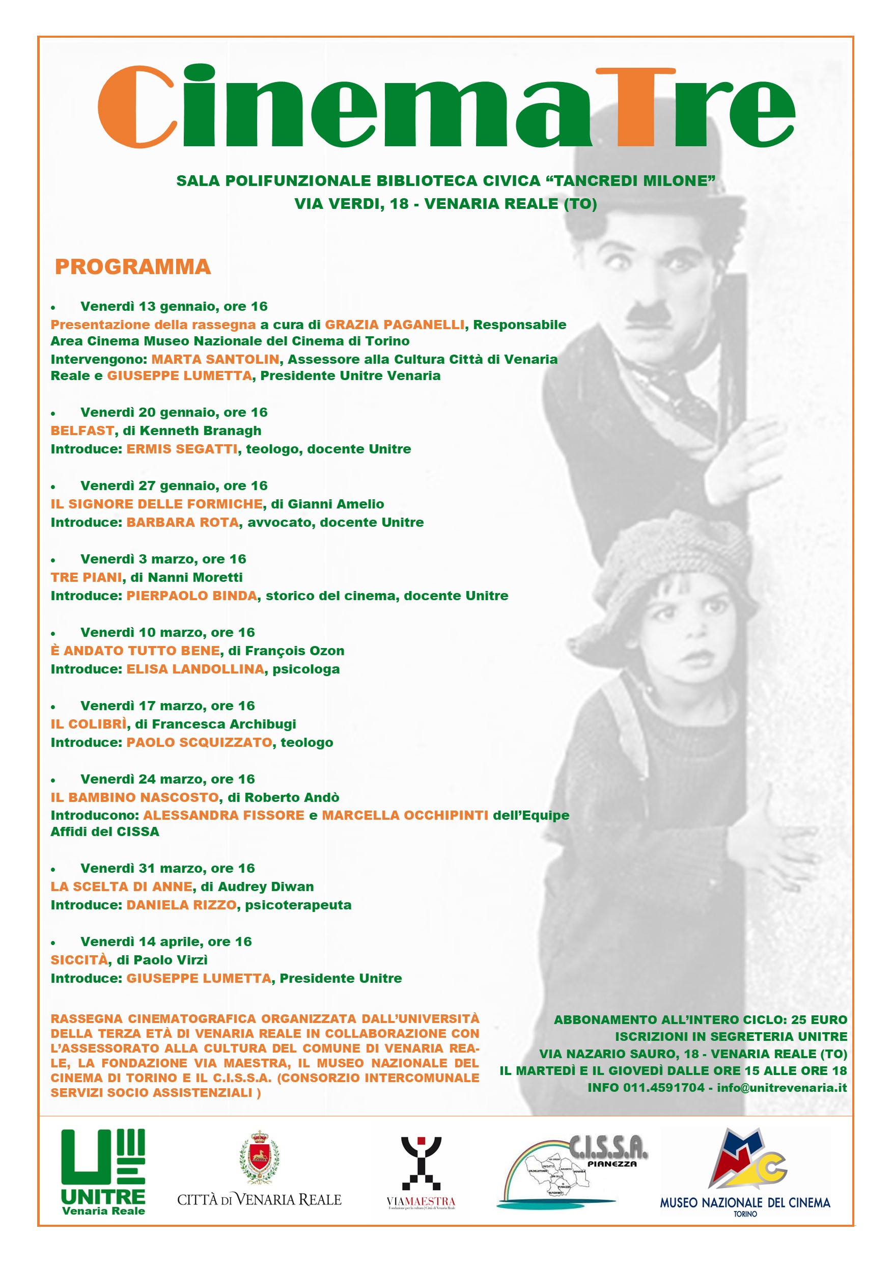 RITORNA CINEMATRE! Per il secondo anno consecutivo l’Unitre di Venaria Reale propone questa rassegna cinematografica denominata CINEMATRE. Quest’anno l’iniziativa vede la positiva collaborazione tra diversi soggetti quali l&rsquo...