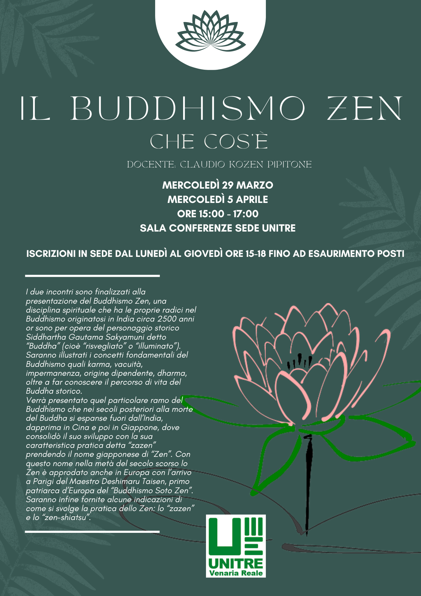 Mercoledì 29 marzo e mercoledì 5 aprile presso la Sala Conferenze della sede Unitre. Docente: Claudio Kozen Pipitone I due incontri sono finalizzati alla presentazione del Buddhismo Zen, una disciplina spirituale che ha le proprie...